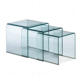 This modern, minimalist nesting table set consists of three elegantly designed tables, stacked to optimize space and add sophistication to any setting. Each table is crafted from a single sheet of thick solid glass, molded into a beautifully curved arch design, ensuring durability and contemporary aesthetics.